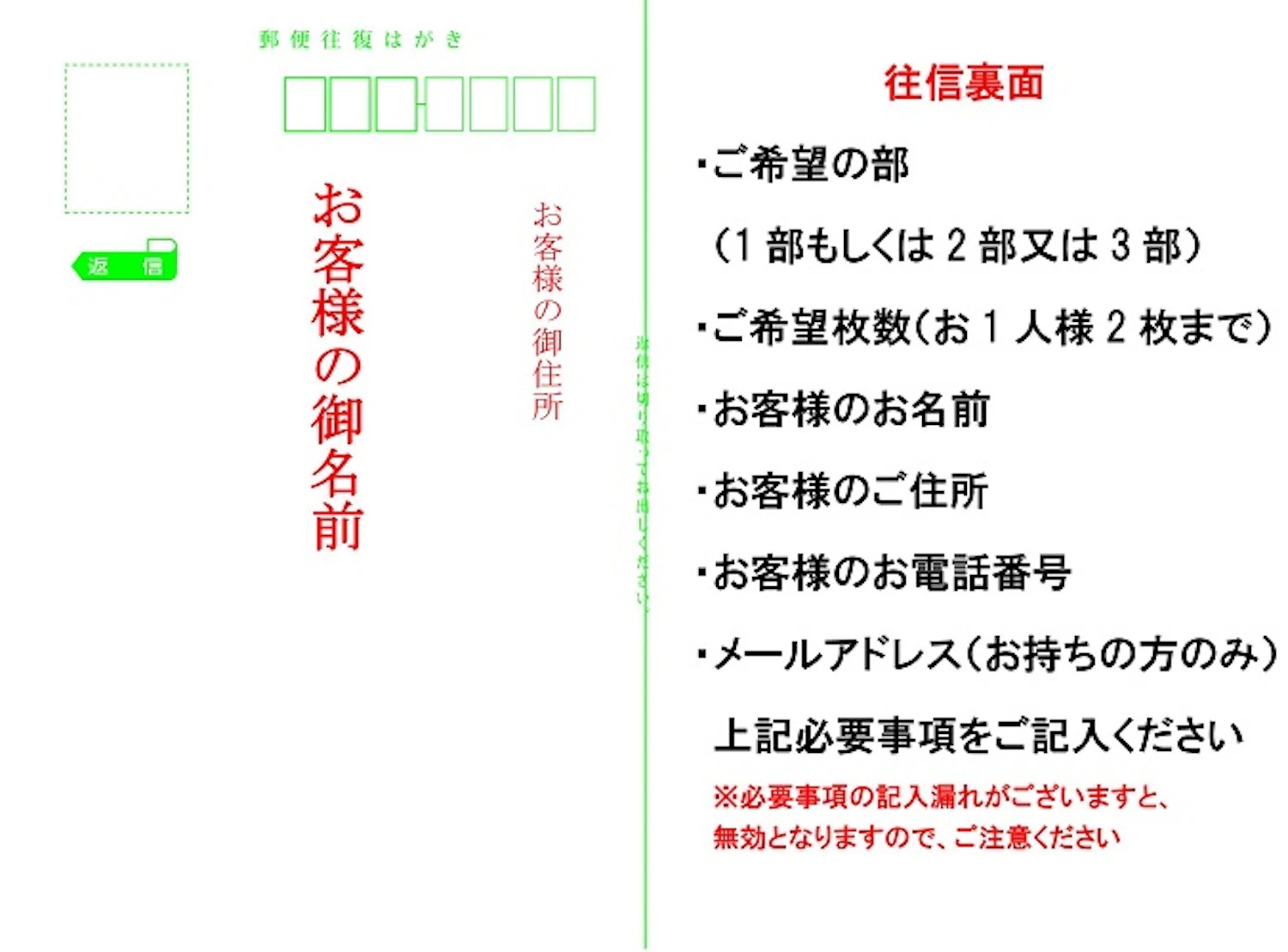 ※お申し込みは、お一人様1部、2部、3部それぞれに1通ずつお申込みいただけます。1通に「1部2部3部希望」は無効になりますので、ご注意ください。また、記入事項に不備がある場合も無効となりますので、記入事項をお確かめの上、ご応募ください。
