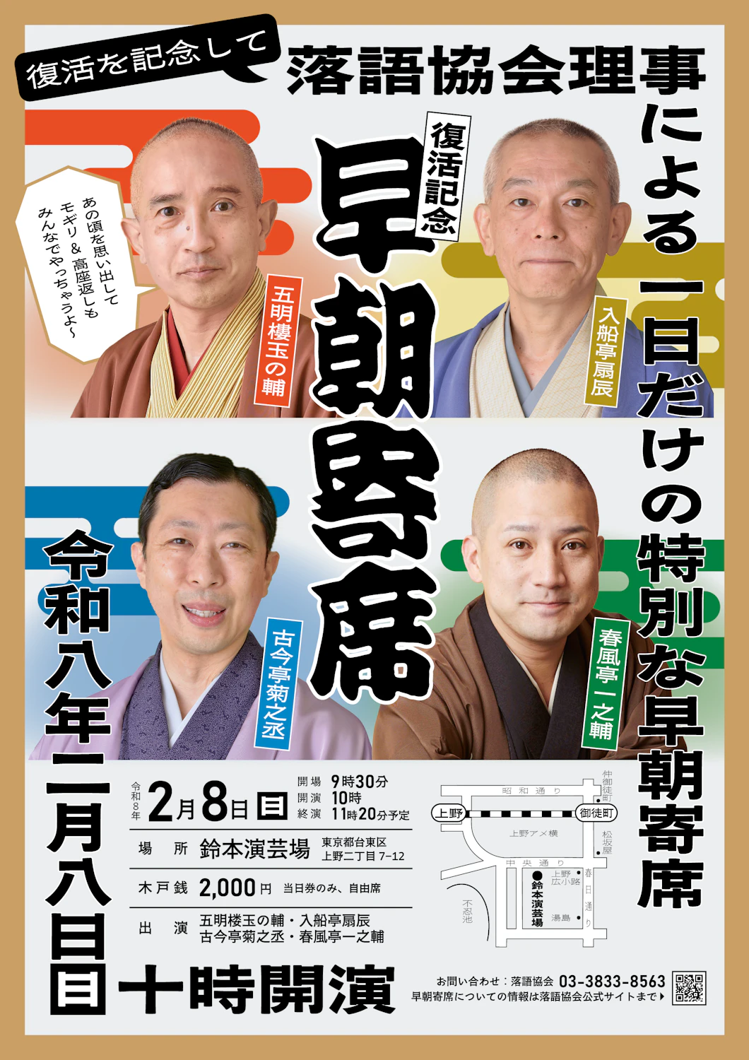令和8年2月15日(日)より「早朝寄席」を復活させることとなりました。