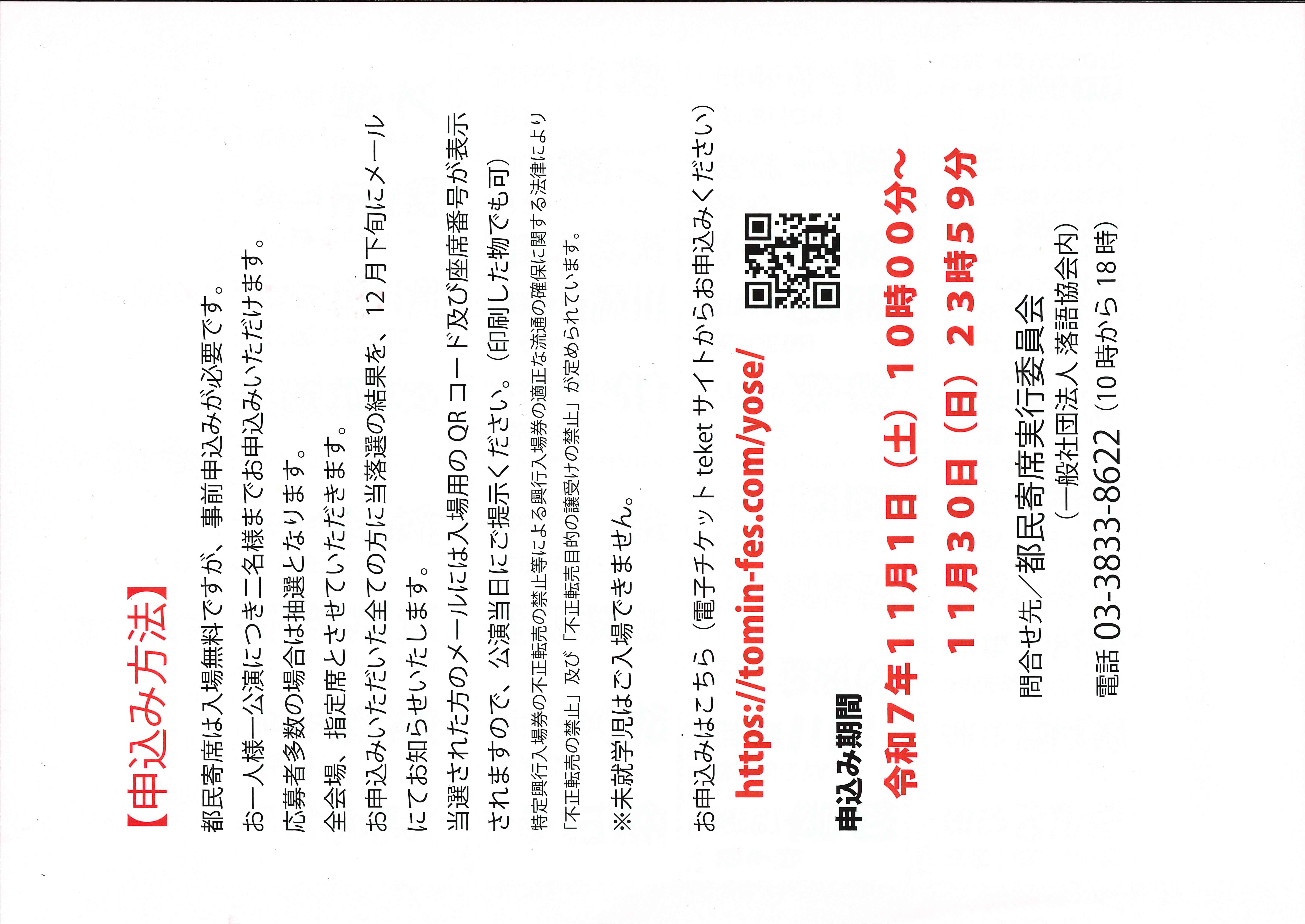 ご応募はこちらから(電子チケットteketサイトからお申込みください):https://tomin-fes.com/yose/